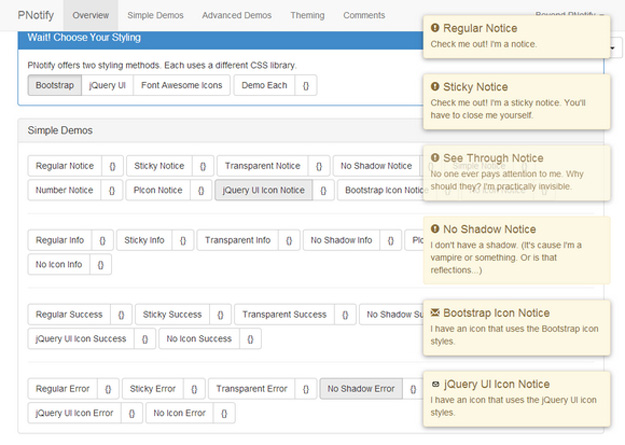 PNotify 是一个由SciActive 开发的 JavaScript的通知插件,曾用名Pines Notify。它的设计理念是提供一个极度灵活而又非常容易实现和使用。它可以提供非阻塞的通知。允许用户在不关闭它的情况下点击通知后面的元素。PNotify 使用了Bootstrap 和 jQuery UI来定义样式,这意味着可以非常容易的对它进行自定义主题样式。