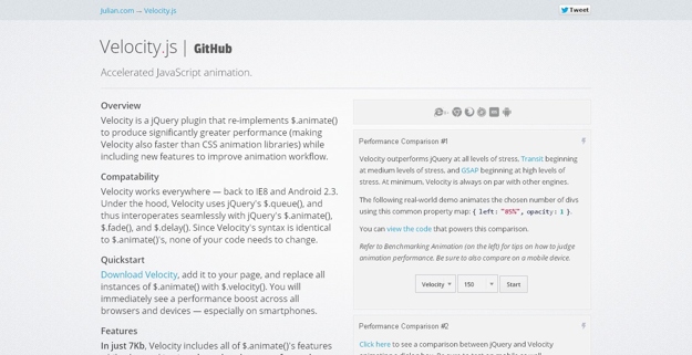 Velocity是一个jQuery插件,它重新实现了$.animate() 同时包括改善动画流程的新特性(使得 Velocity也比CSS动画库更快),用来产生性能显著的动画。