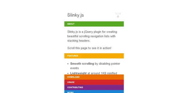 Slinky.js 是一个用在使用堆叠头部创建滑动导航列表的jQuery插件 。它有无数的特性:就像通过禁用光标事件来平滑滑动,压缩后大约1KB的轻量级,在窗口重调大小和DOM改变上刷新,还有和你喜欢的最新版本的浏览器兼容。