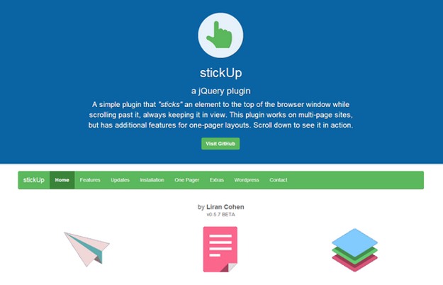 stickUp 是一个jQuery 插件。你可以在任意使用jQuery的网页上执行。你可以简单地在任意页面创建任意你想用户在任何时候都可以看见的元素,只要用户滑超它,就会粘到浏览器窗口的顶部。
