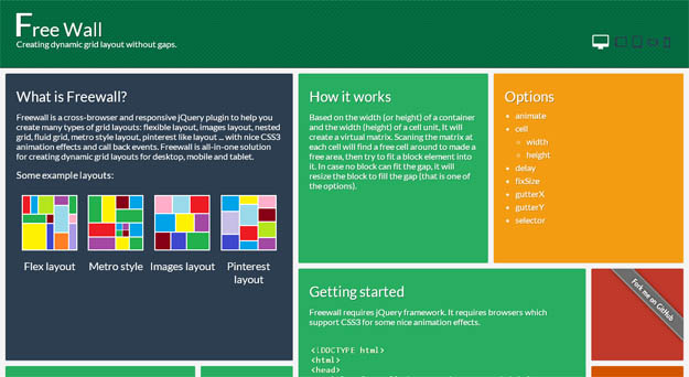 Freewall是一个跨浏览器响应式的jQuery插件,它使用很棒的CSS3动画效果和回调事件,能帮你创建很多类型网格布局:可伸缩布局,图片布局,嵌套网格,流式网格,metro风格网格,类品趣志网格。Freewall是个创建桌面,移动和平板的动态网格布局的一体化解决方案。