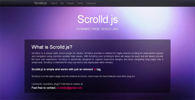 Scrolld.js是一个独特的jQuery开源插件。Scrolld.js使用实时更新的数据为像素级布局和导航提供了一个高度精确的滚动。使用Scrolld.js ,你总能精确的滚动到指定目标并且总能提供最好的用户体验。