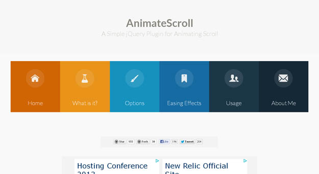 AnimateScroll是一个简单的jQuery插件,可以用来添加松弛的滚动条效果。你可以自定义滚动条样式(30多个滚动效果)以及滚动速度。“padding”属性可以控制滚动条的结束位置。该插件不仅限于整个的body页面,而且可以用于指定的元素。