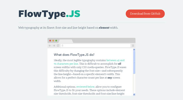 FlowType.JS是一个可以自动调整字体大小(font-size)和行号(line-height)的jQuery插件(根据包装元素的宽度),使得我们的内容可以像我们希望的那样显示。该插件提供了设定最小/最大字体尺寸和宽度的属性。