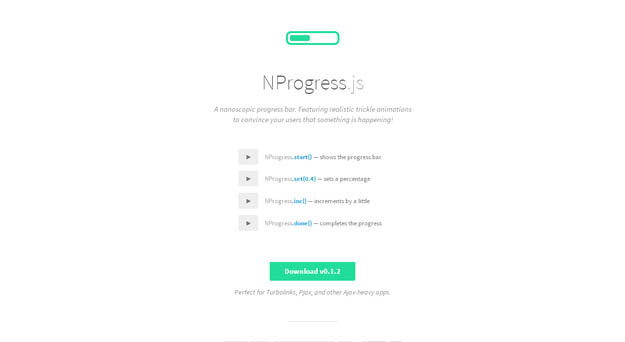 NProgress.js是一个纳米进度条。以现实的细腻的动画告诉用户正在发生的事情。它是一个灵感源于Google,YouTube,和Medium的轻量级的进度条,完美适用于Turbolinks, Pjax,以及其他 Ajax级别的应用。