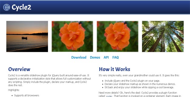 Cycle,是过去的一个非常受欢迎的jQuery幻灯片播放插件,现在有了一个增强的版本:Cycle2.该插件对于那些期待创建完全个性化的幻灯片展示效果的人是非常完美的,因为它没有声明任何标记或样式。并且,它的功能非常灵活。Cycle2支持反应灵敏的布局,几乎包含应对所有的选项(全局或者单张幻灯片),通过使用全部特性的API,还可以非常轻松的进行扩展。