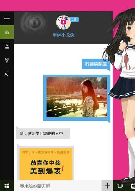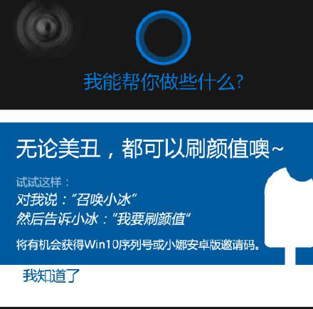 打开Win10系统上的微软小娜,文字或语音输入“召唤小冰”,即可参与小冰对话,小冰称,“在未来的14天里,只要你上传单人大照片,智慧的我 就可以 瞬间 告诉你 :你的长相是 丑到爆表 还是 美到极致。尝鲜的人类 还会有礼物哟。高兴的 时候会送出我姐姐小娜的Android邀请码,但,不高兴的时候送出Windows10序列号。”