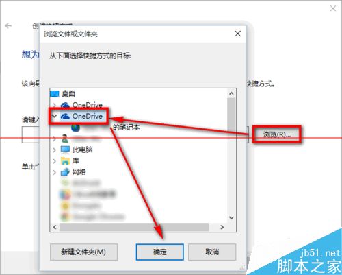 3、在打开的对话框中单击方框右侧的“浏览”,选择“oneDrive”,单击“下一步”。