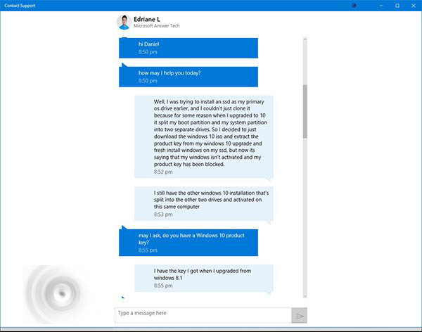 ▲向客服反映换硬盘后无法激活的情况,并且表示自己提取了Win10密钥以便再次安装后使用