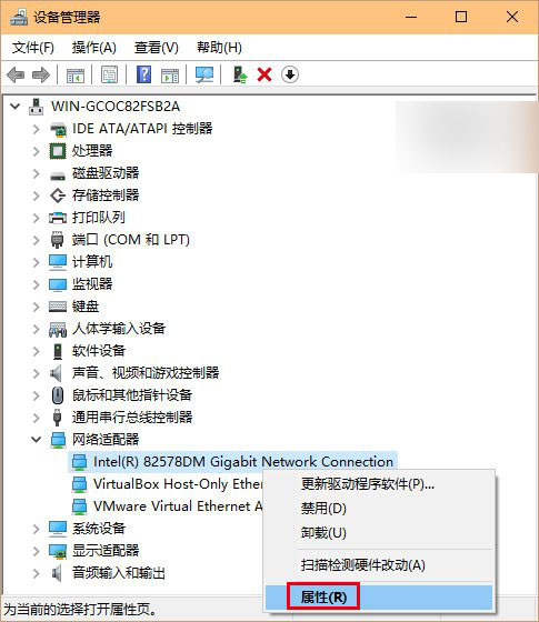 2、找到网络适配器,在有问题的以太网卡或者无线网卡上点击右键,选择“属性”(或直接双击该网卡),如下图——
