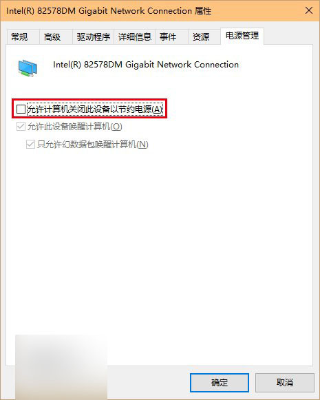 3、点击“电源管理”选项卡,取消勾选“允许计算机关闭此设备以节约电源”后点击确定,如下图——