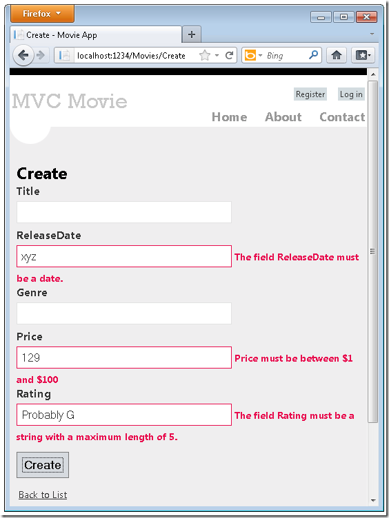 单击Create New链接,来添加一部新电影。在窗体中填写一些无效值,然后单击Create按钮。