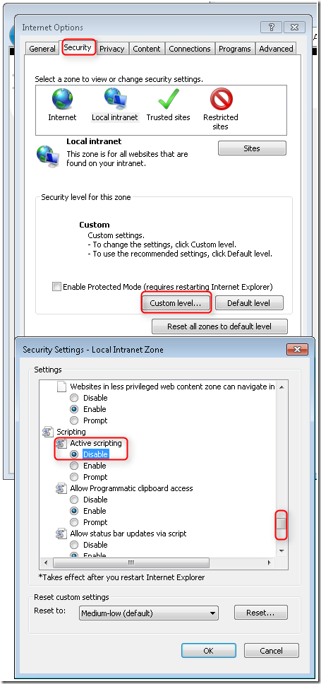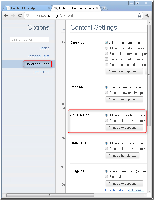 您可以在HttpPost Create方法中设置一个断点,当客户端验证检测到错误时,不会post form数据,所以永远不会调用该方法。如果您在浏览器中禁用 JavaScript,然后提交具有错误信息的form,断点将会命中。您仍然得到充分的验证,即使在没有 JavaScript的情况下。下图显示了如何禁用 Internet Explorer 中的 JavaScript。