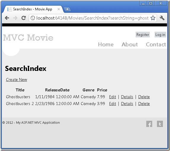 @model IEnumerable<MvcMovie.Models.Movie>@{ViewBag.Title = "SearchIndex"; }<h2>SearchIndex</h2><p>@Html.ActionLink("Create New", "Create") </p> <table><tr><th>Title</th><th>ReleaseDate</th><th>Genre</th><th>Price</th><th></th></tr>@foreach (var item in Model) {<tr><td>@Html.DisplayFor(modelItem => item.Title)</td><td>@Html.DisplayFor(modelItem => item.ReleaseDate)</td><td>@Html.DisplayFor(modelItem => item.Genre)</td><td>@Html.DisplayFor(modelItem => item.Price)</td><td>@Html.ActionLink("Edit", "Edit", new { id=item.ID }) |@Html.ActionLink("Details", "Details", new { id=item.ID }) |@Html.ActionLink("Delete", "Delete", new { id=item.ID })</td></tr> }</table>运行该应用程序,然后转到 /Movies/SearchIndex。追加查询字符串到URL如?searchString=ghost。显示已筛选的电影。