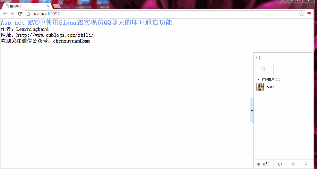 <script type="text/javascript">var systemHub = $.connection.chatHub;/ 连接IM服务器成功// 主要是更新在线用户systemHub.client.onConnected = function (id, userName, allUsers) { var node = chatCore.node, myf = node.list.eq(0), str = "", i = 0; myf.addClass("loading"); onlinenum = allUsers.length; if (onlinenum > 0) {str += "<li class="ChatCore_parentnode ChatCore_liston">"+ "<h5><i></i><span class="ChatCore_parentname">在线用户</span><em class="ChatCore_nums">(" + onlinenum + ")</em></h5>"+ "<ul id="ChatCore_friend_list" class="ChatCore_chatlist">";for (; i < onlinenum; i++) { str += "<li id="userid-" + allUsers[i].UserID + "" data-id="" + allUsers[i].ConnectionId + "" class="ChatCore_childnode" type="one"><img src="/Content/Images/001.jpg?" + allUsers[i].UserID + "" class="ChatCore_oneface"><span class="ChatCore_onename">" + allUsers[i].UserName + "(" + ")</span><em class="ChatCore_time">" + allUsers[i].LoginTime + "</em></li>";}str += "</ul></li>";myf.html(str); } else {myf.html("<li class="ChatCore_errormsg">没有任何数据</li>"); } myf.removeClass("loading");};//消息传输 chatCore.transmit = function () {var node = chatCore.node, log = {};node.sendbtn = $("#ChatCore_sendbtn");node.imwrite = $("#ChatCore_write");//发送log.send = function () { var data = {content: node.imwrite.val(),id: chatCore.nowchat.id,sign_key: "", //密匙_: +new Date }; if (data.content.replace(/s/g, "") === "") {layer.tips("说点啥呗!", "#ChatCore_write", 2);node.imwrite.focus(); } else {//此处皆为模拟var keys = chatCore.nowchat.type + chatCore.nowchat.id;//聊天模版log.html = function (param, type) { return "<li class="" + (type === "me" ? "ChatCore_chateme" : "") + "">"+ "<div class="ChatCore_chatuser">" + function () {if (type === "me") { return "<span class="ChatCore_chattime">" + param.time + "</span>" + "<span class="ChatCore_chatname">" + param.name + "</span>" + "<img src="" + param.face + "" >";} else { return "<img src="" + param.face + "" >" + "<span class="ChatCore_chatname">" + param.name + "</span>" + "<span class="ChatCore_chattime">" + param.time + "</span>";} }()+ "</div>"+ "<div class="ChatCore_chatsay">" + param.content + "<em class="ChatCore_zero"></em></div>" + "</li>";};log.imarea = chatCore.chatbox.find("#ChatCore_area" + keys);log.imarea.append(log.html({ time: new Date().toLocaleString(), name: config.user.name, face: config.user.face, content: data.content}, "me"));node.imwrite.val("").focus();log.imarea.scrollTop(log.imarea[0].scrollHeight);// 调用服务端sendPrivateMessage方法来转发消息systemHub.server.sendPrivateMessage(chatCore.nowchat.id, data.content); }};node.sendbtn.on("click", log.send);node.imwrite.keyup(function (e) { if (e.keyCode === 13) {log.send(); }}); };//用户离线systemHub.client.onUserDisconnected = function (id, userName) { onlinenum = onlinenum - 1; $(".ChatCore_nums").html("(" + onlinenum + ")"); $("#ChatCore_friend_list li[data-id=" + id + "]").remove();};// 启动连接$.connection.hub.start().done(function () { systemHub.server.connect(userid, username); // 调用服务端connect方法}); </script> 上面只是列出了一些核心代码实现。另外,为了实现的酷炫的效果,这里采用了一个Jquery插件:layer,官方网址为:http://layer.layui.com/。这个插件主要为了实现弹出框和弹出层的效果,要实现酷炫的聊天特效,就需要自己写JS代码了,由于本人并不是很熟悉前端,所以这个JS特效代码也是参考网络上的实现。大家如果想运行查看效果,建议到文章末尾下载源码进行运行。