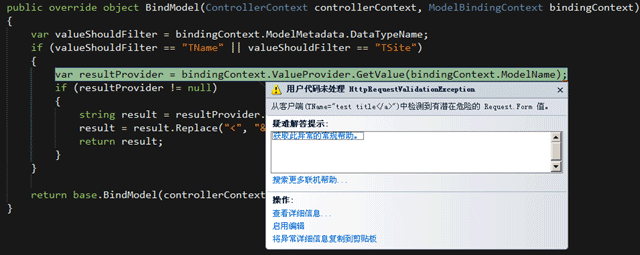 using System;using System.Collections.Generic;using System.Linq;using System.Web;using System.Web.Mvc;namespace MvcApplication1{ public class FilterModelBinder:DefaultModelBinder { public override object BindModel(ControllerContext controllerContext, ModelBindingContext bindingContext) { var valueShouldFilter = bindingContext.ModelMetadata.DataTypeName; if (valueShouldFilter == "TName" || valueShouldFilter == "TSite") { var resultProvider = bindingContext.ValueProvider.GetValue(bindingContext.ModelName); if (resultProvider != null) { string result = resultProvider.AttemptedValue; result = result.Replace("<", "<").Replace(">", ">"); return result; } } return base.BindModel(controllerContext, bindingContext); } }} 第13行,主要是获取我们需要验证的DataTypeName.