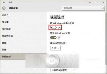 步骤很简单,打开“设置”,然后选择“轻松使用”,在“其他选项”有一个名为“视觉选项”的设置,将其中“在 Windows 中播放动画”这一项关闭即可。
