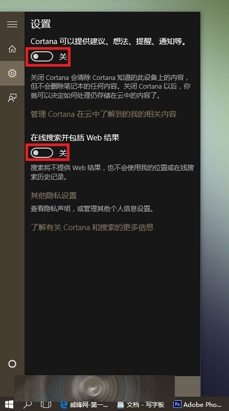 要关闭在线搜索功能很简单,只要点击任务栏中的搜索按钮,然后点击弹出窗口左侧的设置图标,然后在菜单中关闭“在线搜索并包括 Web 结果”即可,如果你不用 Cortana 的话最好也一并关掉,因为每次打开它总会自动联网,更新当地天气、日历信息和今天头条新闻等内容已推荐给你。