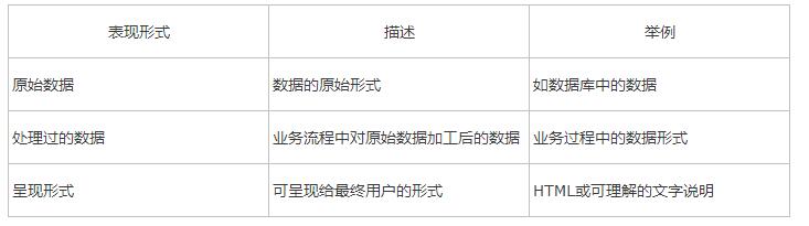 状态的另一个属性是在不同阶段的表现形式。在数据库中存储的是原始格式的数据,业务流程中的是处理过的数据,给最终用户呈现的则是另外的形式。如下表所示: