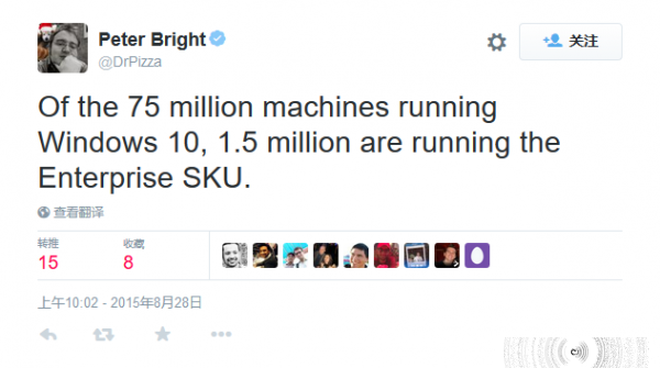 在这7500万台已经升级为Windows 10的设备中,有150多万台设备在运行企业版SKU。”