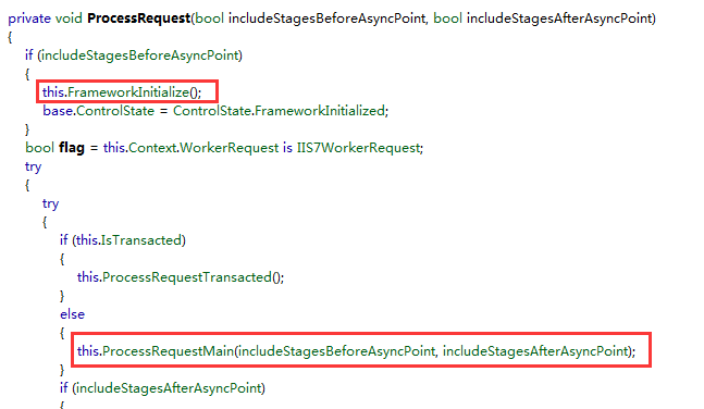 我们用反编译工具查看Page类的ProcessRequest方法可以看见先调用了FrameworkInitialize; FrameworkInitialize里面就是打造了页面控件树,然后调用了ProcessRequestMain,就开始了执行整个页面生命周期了(其实就是调用了一系列的事件方法)(可能部分图看不见右边,可在新标签页中打开图片)