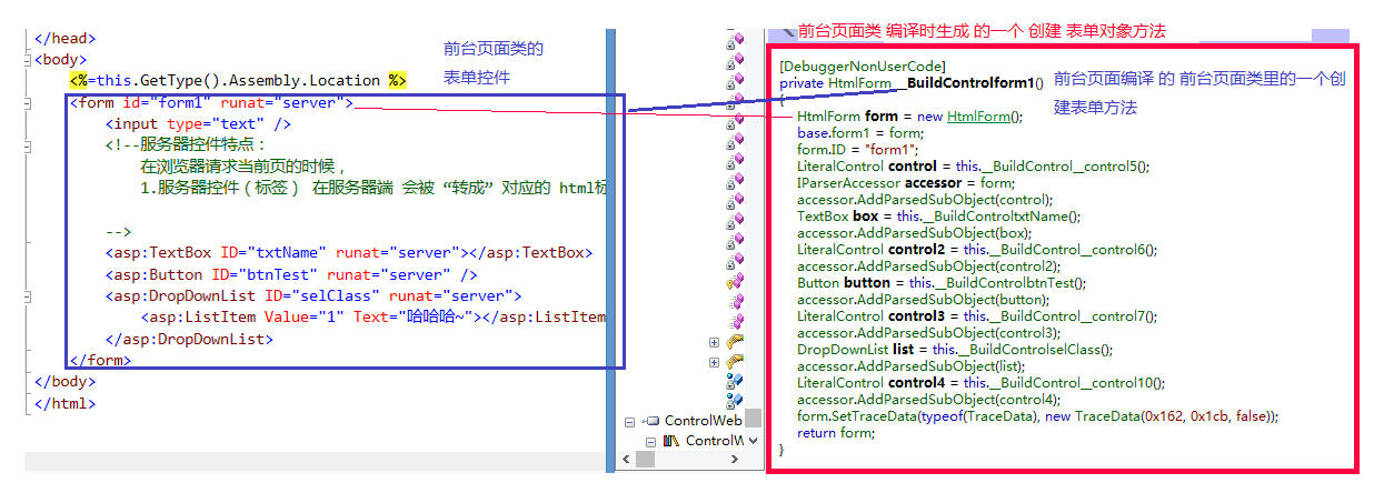 上图中左边是前台页面的代码,右边是对应 生成的打造控件树的代码。中间截取的是生成表单那一部分的代码。