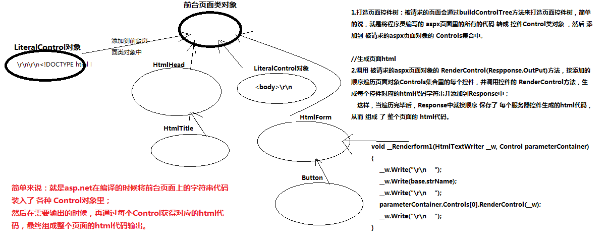 浏览器的DOM树是根据Html标签生成一个C语言的DOM树,而ASP.NET服务器端是用C#打造的一个控件树,也是按照DOM结构打造的。本质是一样。服务器端所有东西都加到页面对象的控件集合中去了。标签在服务器端有对应的控件对象的时候就用控件对象,没有的时候就使用LiteralControl进行封装。不管是服务器控件还是字符串标签(没有runat="server"的标签)都以控件对象的方式存在前台页面类的控件集合里面。好处就是生成前台页面的html代码的时候,只需要遍历控件集合里面的每一个控件对象的RenderControl方法,每一个控件都会调用自己的Render方法生成对应的Html字符串。那么所有控件的生成的html字符串就还原成一个页面的html代码了。