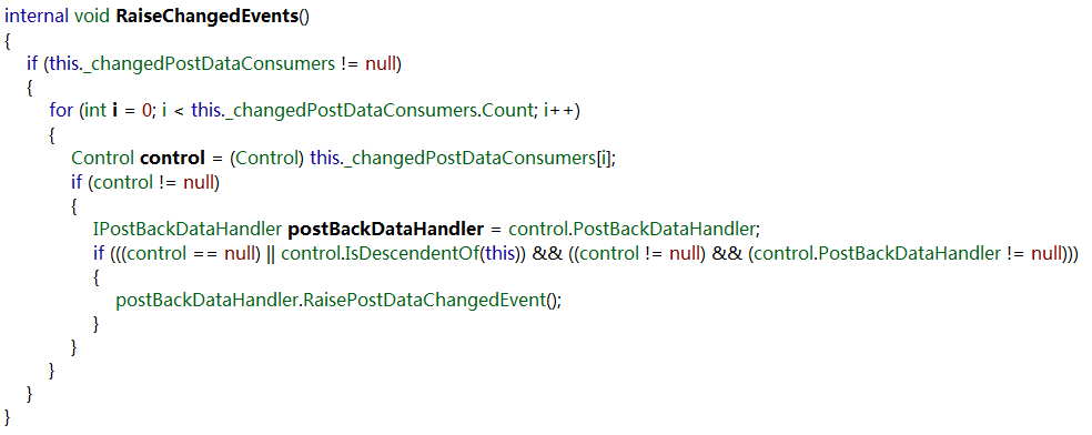 2)将表单里面提交过来的值与ViewState中控件原来的值进行比对,不同则表示要触发该控件的Change 事件,则同时将该控件放到一个集合(看源码其实就是changedPostDataConsumers)中。在后续执行过程中遍历改集合依次触发对应控件的Change事件。