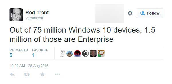 相对来说,Win10企业版安装量虽然只占Windows10总体安装量的一小部分,但是在仅仅一个月内有超过150万Win10企业用户,已经是小有所成。在企业领域,微软是绝对霸主,企业用户也会逐步升级到Win10企业版系统。