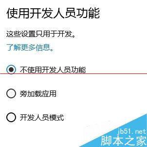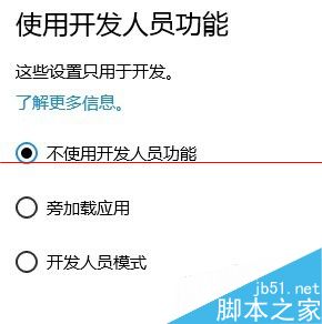 选择“针对开发人员”之后,在右侧的“使用开发人员功能”中,选择“加载旁应用”单选框。当然如果你要获取更高的自由度,你完全可以开启“开发人员模式”。因为WindowsApp平台现在还没有出现任何木马病毒。