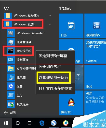依次进入“Windows”按钮-“所有程序”-“Windows系统”,在其列表中找到”命令提示符“并右击,从弹出的右键菜单中选择“以管理员身份运行”项即可。