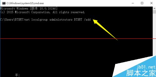 2、从打开的“命令提示符”窗口中,输入命令“net localgroup administrators 用户名 /add”并按回车,即可给当前“用户名”提升为“管理员权限”。