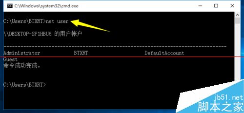 3、接下来再输入“net user”并按回车,即可获得当前系统中所有用户及权限信息,如图所示,表明当前用户已是管理员权限。