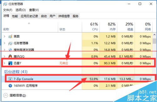 2、从打开的“任务管理器”界面中,切换到“进程”选项卡,从中可以发现“迅雷7”处于“无响应”状态,同时“7-zip Console”进程占用CPU很高。