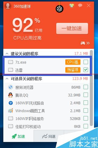 3、使用“360加速球”查看当前系统运行的程序,发现名为“7z.exe”的进程占用CPU极高,如图所示: