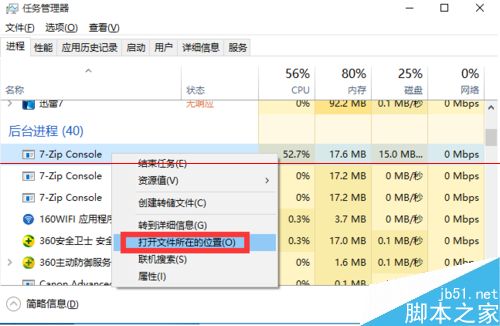 4、接下来在“任务管理器”界面中,右击“7-zip Console”进程,从其右键菜单中选择“打开文件所在的位置”项。