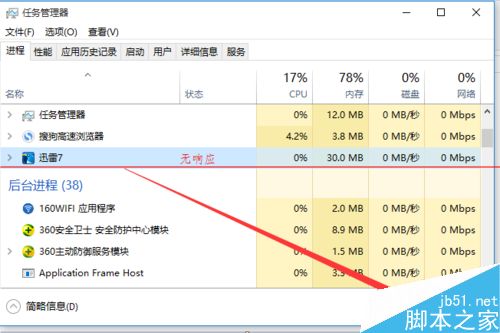7、接下来返回“任务管理器”界面,选中未响应的迅雷进程,点击“结束进程”按钮,以结束当前迅雷程序。