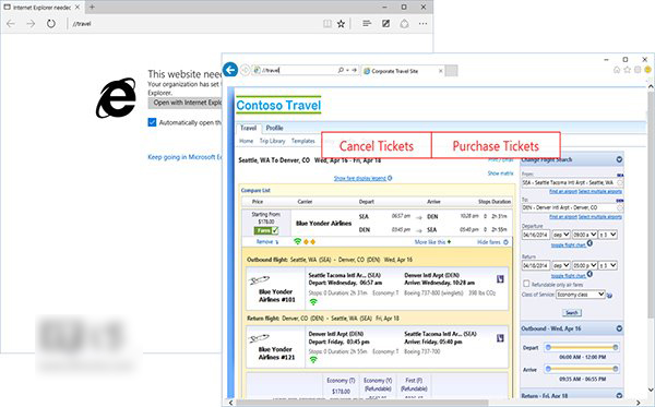 而基于拓展后的企业模式,当用Edge浏览器浏览被添加到列表中的站点时,会自动切换到IE浏览器去访问。