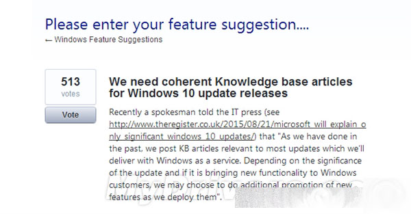 Windows UserVoice上就有人发起了请愿,要求微软公开非安全更新补丁的详情,因为只有这样,大家才知道修复了哪些Bug,从而做对应的部署,事实上告诉大家修复了什么,其实更能鼓励大家升级,尤其是对IT管理员来说,不知详情的补丁可不敢随便装。