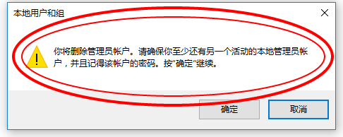注意事项:删除管理员账户,请确保至少还有另一个活动的本地管理员账户,并且记得该账户的密码。