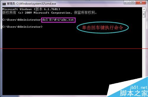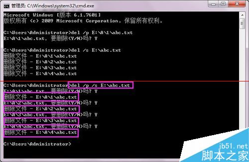 6、删除所有子目录下的指定文件时显示“是否删除”提示:删除E盘下所有文件名为abc的文本文件时显示“是否删除”提示,需在命令提示符窗口中键入“del /p /s E:abc.txt”命令,单击回车键执行该命令,并根据提示操作。