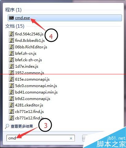 1、打开cmd命令提示符:以Windows 7操作系统为例,单击“开始”,在“搜索程序和文件”框中输入“cmd”,单击“cmd.exe”,弹出cmd命令提示符窗口。
