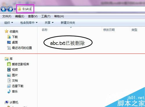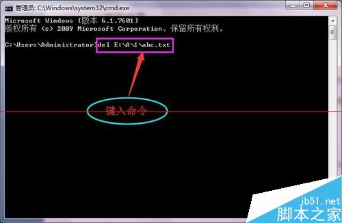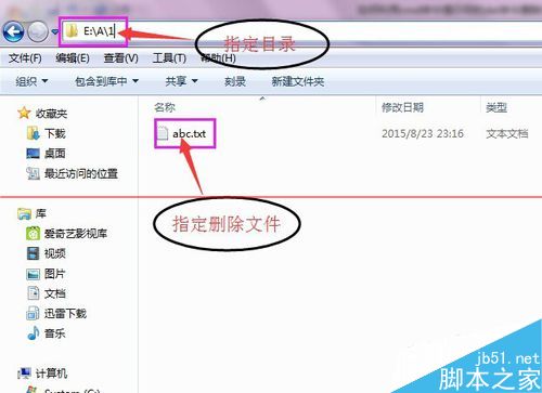 2、删除单个指定文件第一步:删除下图所示的abc.txt文件,需在命令提示符窗口中键入“del E:A1abc.txt”命令,该命令的含义是删除硬盘E下文件夹A中子文件夹1中的abc.txt文件。