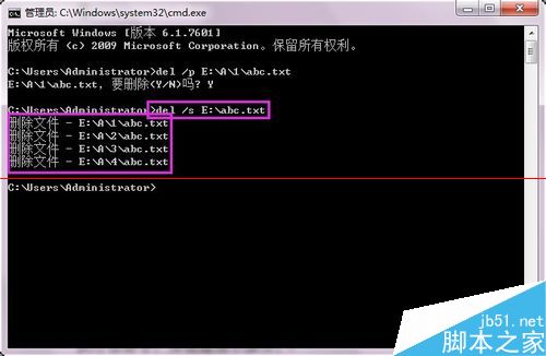 5、删除所有子目录下的指定文件:想要删除E盘下所有文件名为abc的文本文件,需在命令提示符窗口中键入“del /s E:abc.txt”命令,单击回车键执行该命令,窗口中将显示所有符合命令要求的已被删除的指定文件。/s指在所有子文件夹中删除指定文件。