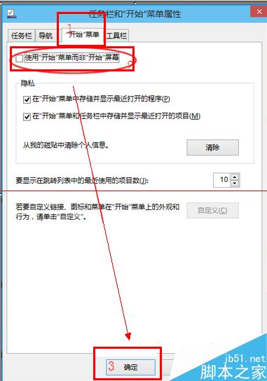 2、然后会弹出任务栏和开始菜单设置属性,在这里我们切换到"开始菜单"选项卡,然后将“使用“开始”菜单而非“开始”屏幕”前面的“√”去掉,之后再点击“确定”。