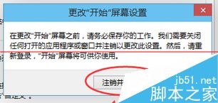 3、接下来会弹出一个“更改开始屏幕设置”对话框,我们点击“注销并更改设置”。