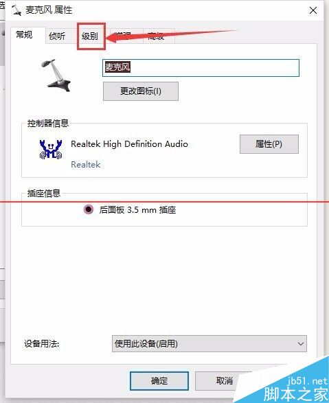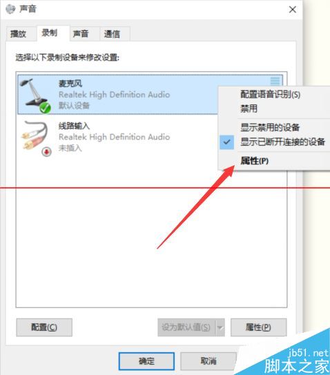 3、在这里可以看到我们的麦克风设备是否在工作,右键默认麦克风,选择属性