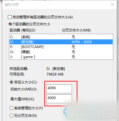 6、然后选择系统分区以外的分区,选择自定义大小,最小值为内存大小两倍(2G物理内存=2G*2*1024=4096MB)最大值自定。再点设置,重启后生效。