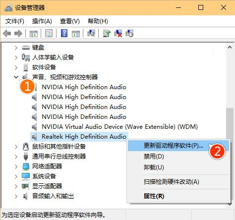 此时要用到设备管理器,你可以在Cortana搜索栏搜索“设备管理器”,然后选择第一个结果进入;也可以在开始按钮单击右键,选择这一项后进入。然后找到“声音、视频和游戏控制器”,点击左侧箭头展开,选择你的声卡。此时你可以右键单击该项目,选择“更新驱动程序软件”。一般来说,如果驱动程序安装不正确,使用这种方法可以解决大部分问题。如果无法解决或者安装失败,也可以尝试先卸载该设备,然后再“扫描检测硬件改动”,重新安装声卡。