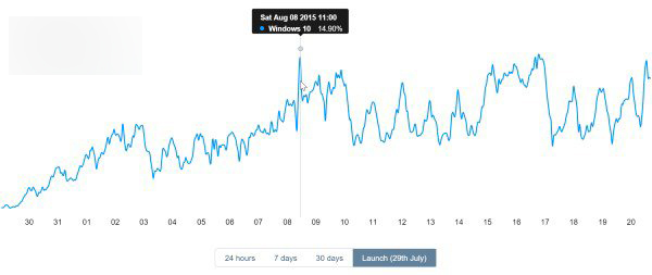 通过GoSquared给出的数据表,可以看出Win10使用率的发展趋势,并且趋势明显,稳定上升。Win10正式版发布后,在8月8日达到一个峰值,为15%左右。